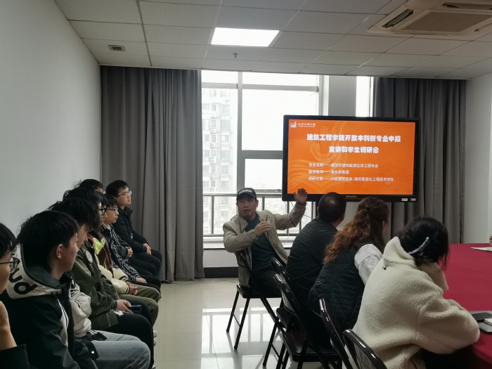首先,韦定兵向学生宣布建筑设备工程系将于本年度申报开放本科新专业——建筑环境与能源应用工程;接着,杲东彦教授从新专业的人才培养方案、职业面向、人才市场需求以及与建筑设备、建筑智能化专业课程体系对接向学生作了一一介绍;最后,围绕“是否愿意报考”“影响报考开放学习的因素”“对新专业申报有何建议”等问题师生们展开热烈讨论,同学们纷纷表示,在科技水平迅猛发展的时代,终身学习十分必要,如果学校能提供与自身职业需求和职业发展相契合的继续学习途径,一定会选择参与学习,不断提升自我。