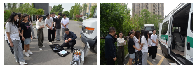 观摩应急车,“识别”各类现场监测仪器。结合同学专业课程学习需求,中心现场监测部工程师梁宵现场展示了包括水质(定深采样器、石油类采样器)、噪声(声级计的校准及延长杆的使用)、环境空气(气泡吸收管、玻板吸收管、针筒、真空瓶、气袋、活性炭采样管、苏码罐的不同应用场景)、烟气(气态污染物、颗粒态污染物的监测方法和烟道布点方式)等不同类型采样仪器,简要介绍了水质、大气应急监测车的车载设备、监测指标和主要工作原理,并耐心解答同学们提出的采样规范、难易程度等问题。