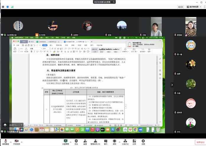 王铮副院长首先介绍了与会专家及参会人员和会议流程,同时对艺术学院专业设置和本次培养方案的修订要求进行说明和解读。在专业汇报环节,系主任首先汇报专业的基本情况,详细阐述人才培养方案的培养目标、毕业要求及其观测指标、办学特色与特色课程支撑、毕业学分配置、课程对毕业要求支撑课时分配和实践教学的安排等内容。汇报之后,专家结合专业、行业特点,紧紧围绕高等职业教育教学的特色、对标企业人才需求,从培养方案框架、课程体系构成、学时分配、课证融通、实践教学设计等方面给出了中肯的修改意见和可行性建议,对培养方案的完善起到了指导性作用。毕业生代表也就专业课学习过程中的感受和问题进行了反馈,促进人才培养方案进行有针对性的修订。各系认真记录各位专家的建议,并表示根据专家的意见尽快修订完善2023级人才培养方案。
