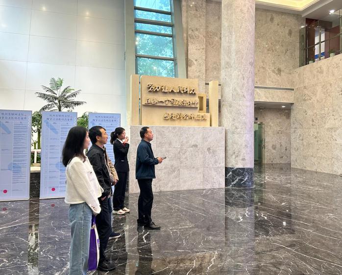 随后,由专职讲解员为我院一行详细介绍杭州互联网法院的发展历程、运行模式、特色优势以及典型案例。经讲解得知,杭州互联网法院是全球第一家互联网法院,创新开创异地审理模式,以信息化、标准化手段,对审判环节的主要流程、关键环节进行重设,提高办案效率。我院教师纷纷赞叹杭州互联网法院将科技辅助司法的效用体现得淋漓尽致。