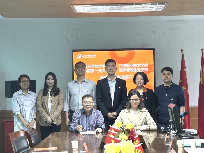 为充分发挥系统办学优势和党建引领作用,进一步将主题教育走深走实,实现发展共赢,5月10日下午,在定淮门东校区411会议室,商学院第一党支部与江阴职业技术学院(江阴开放大学)经济管理系党支部举行了党建共建签约仪式。江阴职业技术学院(江阴开放大学)党委委员刘建龙、经济管理系党支部书记李根芹、副书记蔡正焱,继续教育学院党支部副书记何伟,商学院党总支副书记董昕灵、党总支委员徐永兵、第一党支部书记左秀平及党员教师代表出席签约仪式。会议由董昕灵主持。