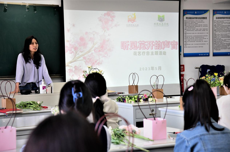 听完老师们的讲授,花香四溢的活动现场,同学们个个都跃跃欲试。选定花材、修剪花枝、摆弄造型……同学们充分发挥想象力和创造力,把原本普通的花草搭配得错落有致、赏心悦目。品花、插画、赏花,在自我体验、交流互动中,同学们的情绪得到舒缓和释放,内心得以平复与和解,自我价值获得肯定和满足。