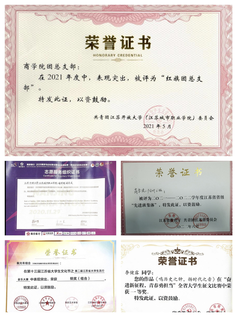 商学院团总支部积极开展各具特色的校园文化活动,组织推动新时代大学校园文化建设,积极开展第二课堂实践活动,以攀登计划、“挑战杯”、专业技能大赛等各类大型省级科技赛事为契机,带领同学们积极参加各类科技技能竞赛和文体类竞赛等,并斩获多个奖项。其中“抗疫事迹对青年学生社会动员的三维逻辑向度”专项作品获江苏省“力行杯”社会实践项目三等奖、“可回收垃圾”调查项目获江苏省第十七届“挑战杯”大学生课外学术科技作品竞赛三等奖、2021年全国大学生数学建模竞赛江苏赛区二等奖、“‘懿茗似卿’全国领先的茶叶产业链改造方案”项目获第七届江苏省“互联网+”大学生创新创业大赛“青年红色逐梦之旅”三等奖;文体类竞赛成果获奖也颇丰,如2020年度江苏省大学生网络文化节二等奖、2021年“第二届江苏省大学生流行音乐大赛”总决赛中摘得铜奖、2022年度江苏省“奋进新征程 青春勇担当”征文比赛一等奖等。