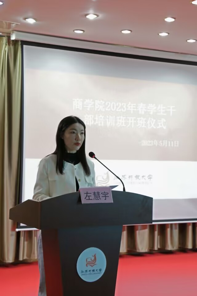5月11日,商学院2023年春学期学生干部培训班开班仪式在东校区5楼报告厅举行,团总支副书记左慧宇主持会议。开班仪式在响亮的国歌声中拉开帷幕,左慧宇指出当前学生干部队伍存在的不足,强调开展学生干部培训的重要意义,并对学生干部提出要强化理论武装,明确身份定位,重视方法创新等几点要求。