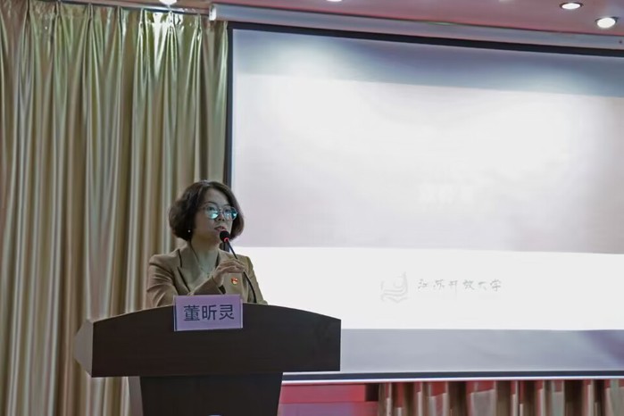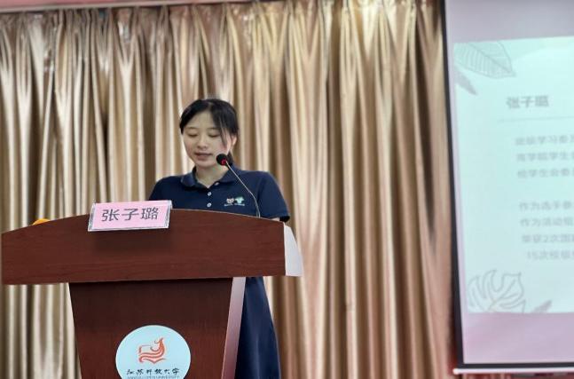 商学院党总支副书记董昕灵以“实干逐梦 奋勇争先”为主题,从学生干部的工作态度、工作方法、团结奋斗、自我斗争等方面展开,向各位学生干部讲述身为学生干部应该具备的品质素养和发挥的重要作用,积极传播正能量,带领更多的同学向上、向善,展示青年风采。
