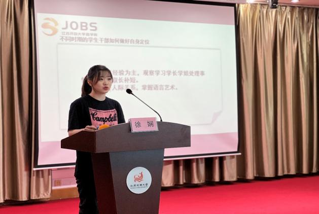 学院第七届团总支学生副书记徐娴和第七届学生会主席团成员张子璐分别以“引领学生思想 勇担干部责任”和“立可为之志做筑梦新青年”为主题,分别从思想引领、奉献服务、组织活动、统筹协调方面分享工作经验,与现场学生干部进行互动交流,对大家任职期间遇到的困惑和难题一一进行解答。