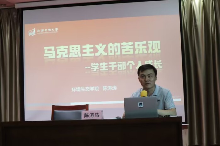 环境生态学院学工办副主任、团总支副书记陈涛涛以“马克思主义的苦乐观——学生干部个人成长”为主题,详细阐述马克思主义的苦乐观,并向学生干部提出殷切的期盼,希望广大学生干部都能认真学习领悟马克思主义的苦乐观,严格要求自己,争做优秀的学生干部。
