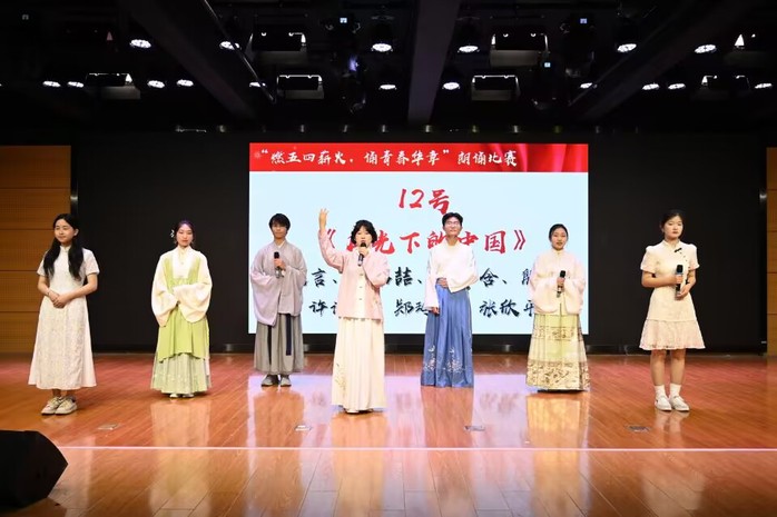 经过各学院层层选拔,最终12支队伍进入学校决赛。校赛分为两轮,第一轮,评委根据选手的朗诵内容、语言流畅度、情感表达、普通话标准程度、朗诵仪态进行打分。成绩在前六名的队伍,晋级第二轮比赛,第二轮为即兴评述。