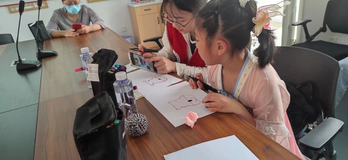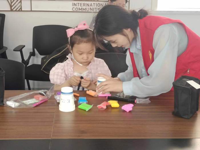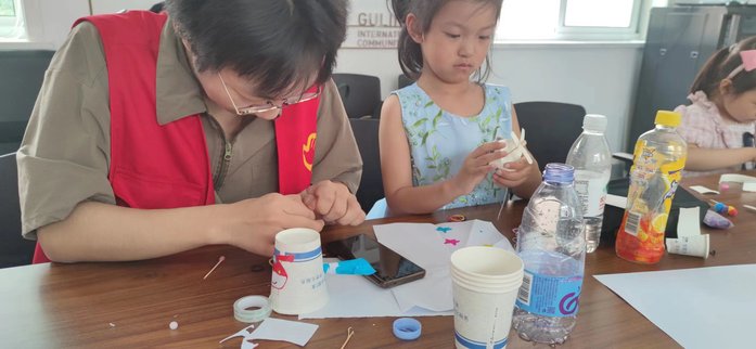小朋友们在家长的陪伴下,带着自备的材料,在志愿者们的帮助下共同DIY制作环保手工。志愿者们细心、耐心地指导小朋友制作,与小朋友共同画画,不断地鼓励小朋友,在制作过程中还给小朋友们讲解所用的环保工具,给小朋友留下美好的回忆。