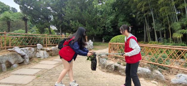 古林公园位于东校区附近,风景优美,清晨的古林公园充满别样生机,聚集了跳舞的老奶奶和下棋的老爷爷。志愿者们拿着垃圾袋和工具,分工在不同区域清理垃圾、美化环境,他们的身影散布在公园的各个角落。