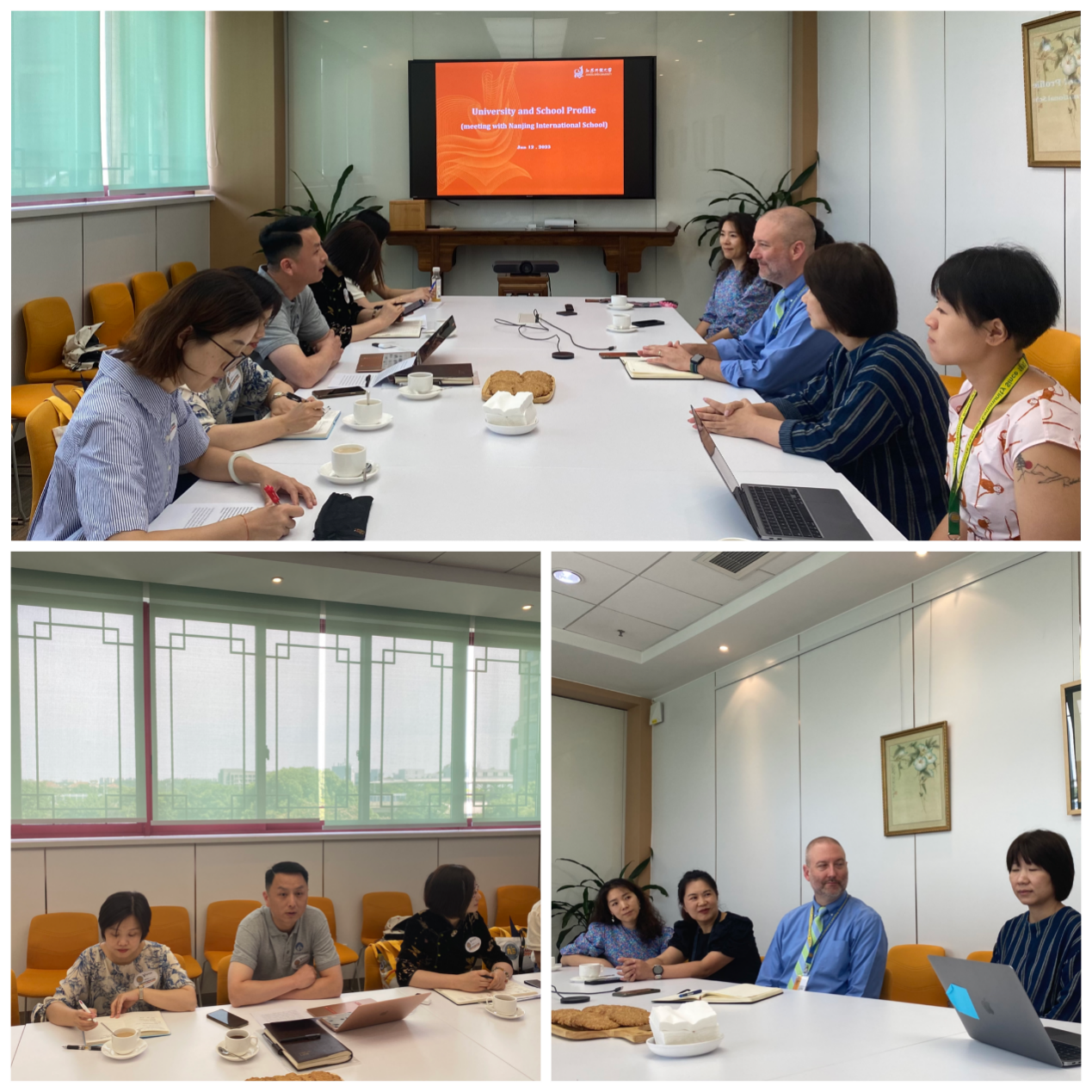 随后,双方在会议室开展洽谈。杨远向校方介绍了江苏开放大学和外国语学院,刘姮博士介绍了汉语国际教育专业,江苏开放大学创新 开放 融合 共享的办学理念,服务全民终身学习的举措受到了对方高度赞扬。NIS小学部副校长Zhang Bo和中学语文教师Angel Chen分享了在汉语教学中碰到的实际问题和困惑。双方进一步在建立实践基地、寒暑假夏令营、互派师生参观学习、文化交流活动、合作开展科研、教改、教材开发等方面做了探讨。最后,双方互赠纪念品,并约定尽快推动合作协议签订。