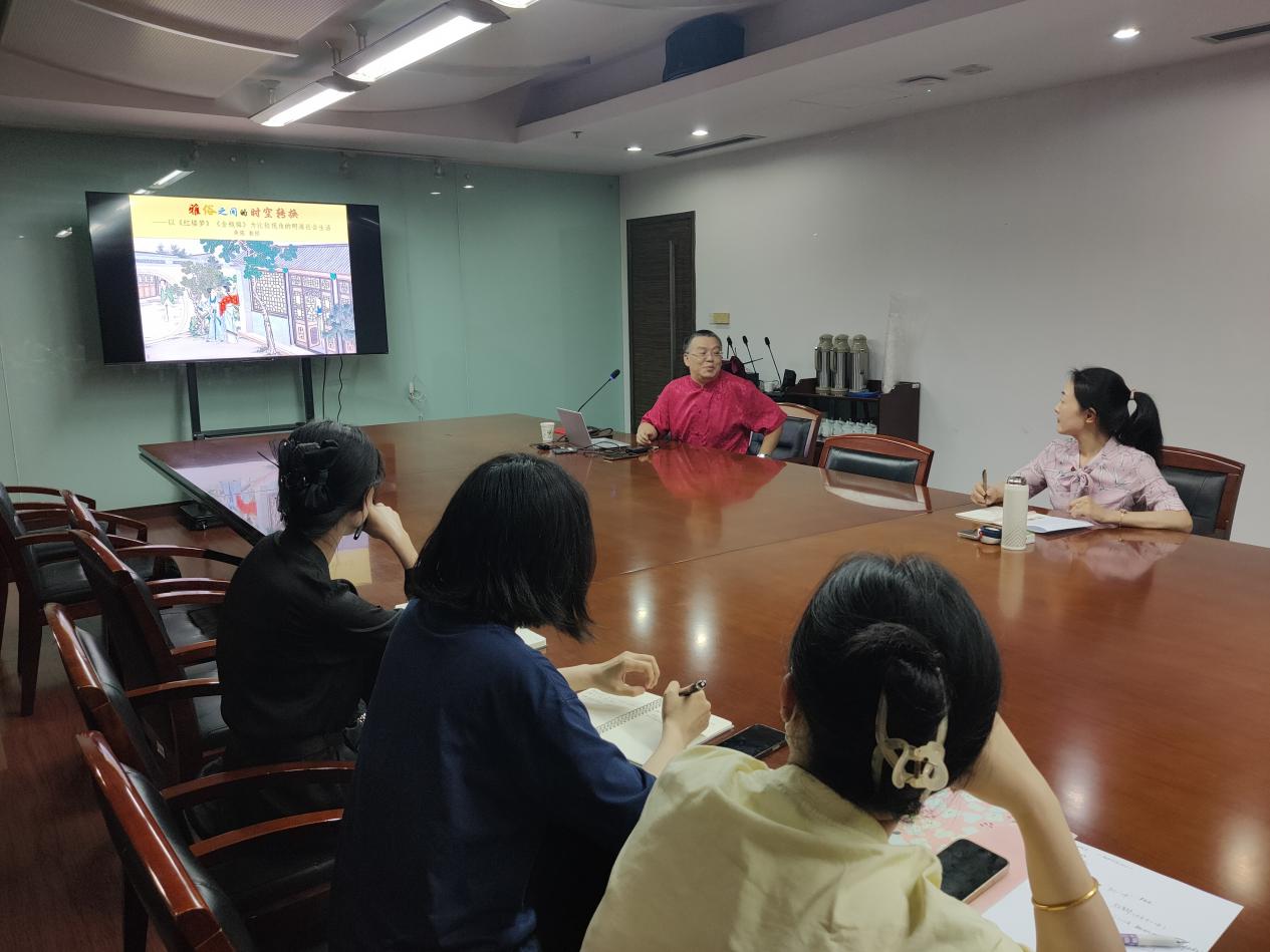 6月14日,艺术学院在定淮门校区综合楼二楼第三会议室继续与江苏省红楼梦学会联合举办“承艺弘文,育善向美”系列讲座,邀请南京晓庄学院客座教授,服饰史学家、金学家黄强,做题为“雅俗之间的时空转换——以《红楼梦》《金瓶梅》为比较视角的明清社会生活”的学术讲座。此次讲座由艺术学院院长、党总支副书记黄一斓主持,艺术学院全体教师参加讲座。