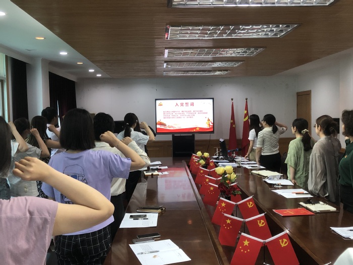 随后,在鲜红的党旗下,全体党员佩戴党徽,举起右手,握紧拳头,一起宣读入党誓词,在铿锵有力的誓词中,表达了对党的忠诚与决心。