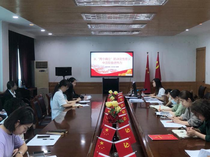 第二党支部书记任静静同志以“从‘两个确立’的决定性意义中汲取奋进伟力”为题做毕业生党员专题党课教育,从理论维度和实践维度,带领毕业生党员深刻理解“两个确立”是在新时代坚持和发展中国特色社会主义的伟大实践中孕育而成的丰富内涵,深刻阐述“两个确立”为加强党的全面领导提供根本政治保证、为建设社会主义现代化强国提供科学行动指南、为实现中华民族伟大复兴凝聚磅礴精神动力的伟大意义。