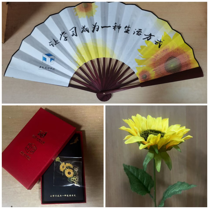 班会上,所有同学感慨万千。有同学说大学几年有很多遗憾,不可能同时拥有青春和对青春的感悟;有同学说大学几年有很多收获,最深刻的还是跟同学跟室友一起笑一起哭一起闹的日子;有同学说出新的规划和期待,毕业又是新的开始。现场,老师们给每位毕业生赠送了太阳花——向日葵。向日葵是建筑工程学院的院花,象征着希望和力量,希望同学们像院花一样向阳生长、逐光而行,不惧困难、不负韶华,更祝福同学们在新的征程上一举夺“葵”,前程似锦。学院还为学生们精心准备了印有学校学院文化标识的扇子、书签等文创纪念品作为毕业小礼物,毕业生们纷纷表示被学院的巧思和心意所感动,拿起院花一起合影留下最美好的回忆