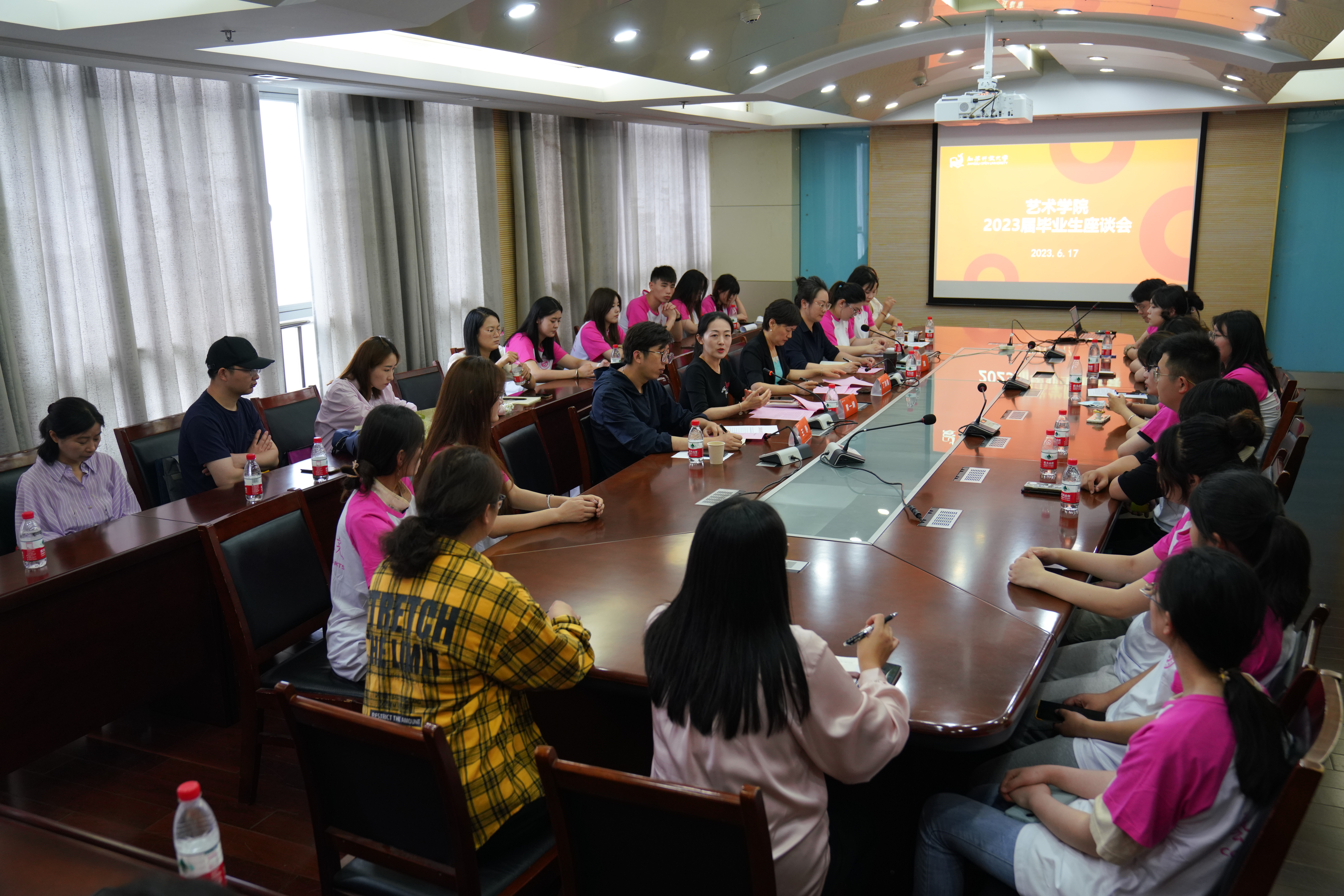 6月17日,艺术学院2023届毕业生座谈会在应天校区综合楼8楼会议室举行。学院领导班子、学工办主任、毕业班班主任、形象艺术系教师代表以及辅导员,与毕业生代表相聚一堂,共叙三年学习生活和成长感悟。校党委常委、副校长尤佳春出席了此次座谈会。