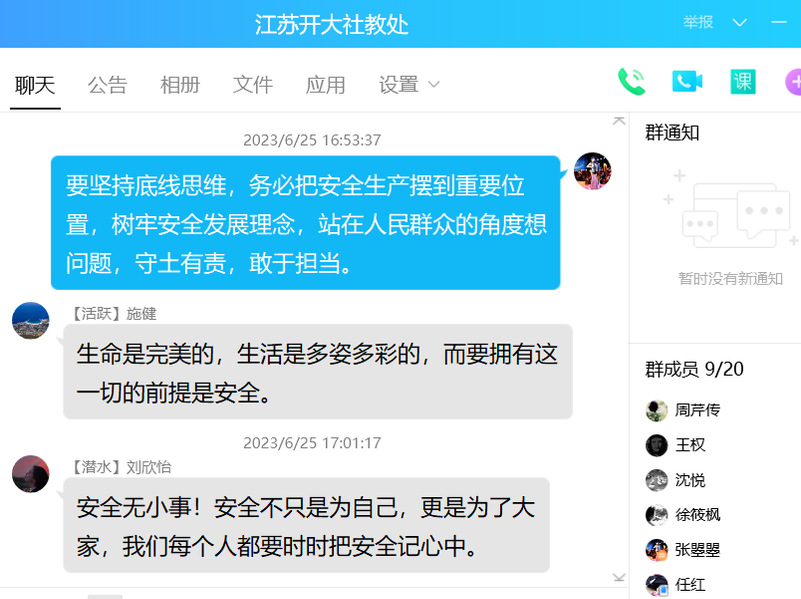 6月中下旬,工作组对各科室安全工作进行摸排,并于25日组织各科室开展《关于安全生产,习近平总书记这样说》宣讲活动,组织部门全体教职工完成“人人讲安全、个个会应急”网络知识竞赛,通过线上分享安全教育心得体会。