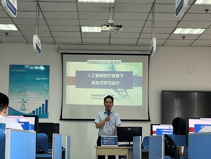柏宏权教授以“人工智能时代背景下混合式学习设计”为题,详细介绍了混合式学习的定义及其设计方法;强调混合式学习设计需要充分发挥面对面教学与线上教学的优势,将二者有机结合,从而适应不同的学习节奏和学习需求。