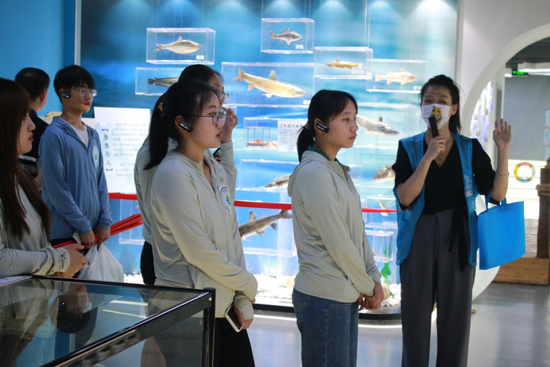 下午,实践团队来到长江江豚科教中心,围绕江豚保护主题,了解江豚保护最新调研数据、长江水水质状况,科普长江江豚特征与习性,学习江豚保护相关知识。大家通过观看白鱀豚、长江江豚、中华鲟标本,聆听江豚保护背景、种群现状、保护进展和南京江豚类保护区基本情况介绍,沉浸式体验“邂逅”长江江豚,直观感受长江流域保护区内的自然生活状况,在“长江漂流”中进行了一场身临其境的科学考察。