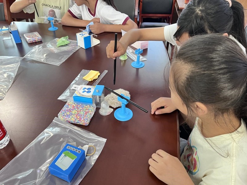 下半场活动由李明毅同学以“探索静电现象”为主题,示范、指导孩子们探索静电的存在,并讲解静电预防的相关知识。实验时,孩子们用带电的胶棒吸引了泡沫球,也在旋转架上探究电荷关系运动。最后,经过小李老师讲解,孩子们用自己的语言总结了学习成果,确立了“同极相斥,异极相吸”的科学认识。