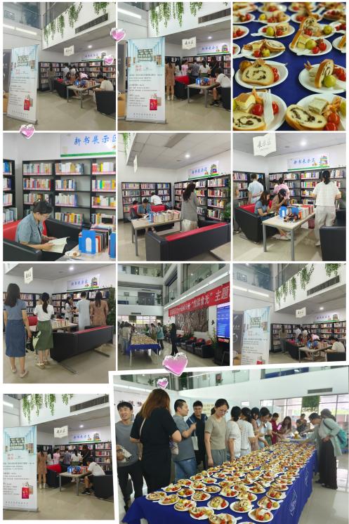 活动现场人头攒动。美食区香气四溢,精致的糕点、清甜的果汁牵动着体验者的味蕾。在定淮门校区的新书展示区,陈列了近200册图书馆最新上架新书。举目望去,茅盾文学奖新作、鲁迅文学奖新作、2023年“世界读书日”书单、“2022年文学好书榜”上榜新书等鳞次栉比,满满的精神食粮氤氲着浓浓书香,不一会儿,借阅登记簿上就写满了密密麻麻的借阅信息。老师们在阅读的同时,品尝美食,相互交流,相互学习。