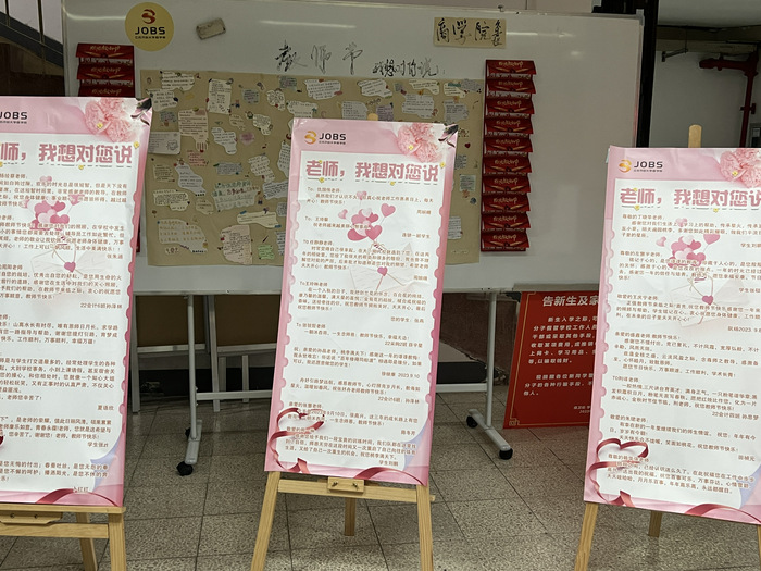 商学院学子们用心制作对老师祝福的卡片,并挑选出一部分制作成海报,于9月10—13日在东校区教学楼一楼大厅展示,用这种温暖而独特的方式表达对老师们的尊敬和爱意。