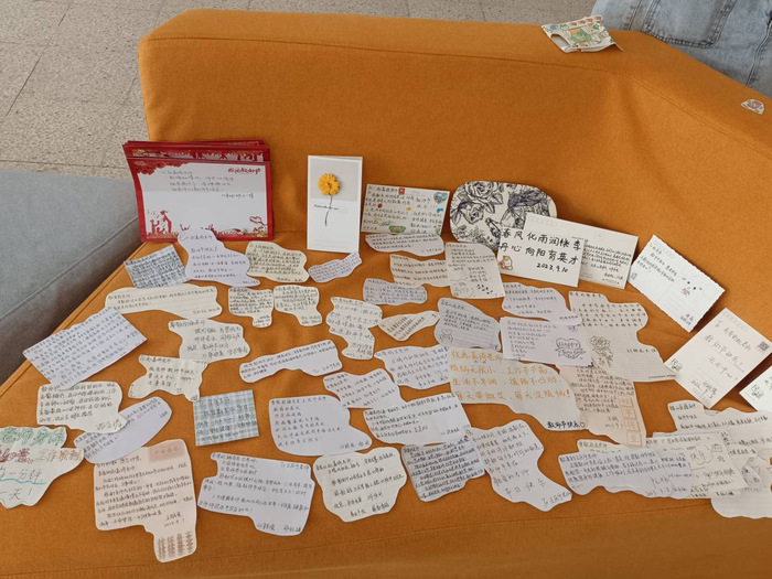教学楼大厅内摆满了五彩斑斓的纸张和装饰物,形成了一道靓丽的风景线。同学们互相交流心声、展示作品,完成之后便将作品张贴在公告栏上。每一张卡片都各具特色,有的绘满鲜艳的图案和文字,有的写满动人的祝福话语。