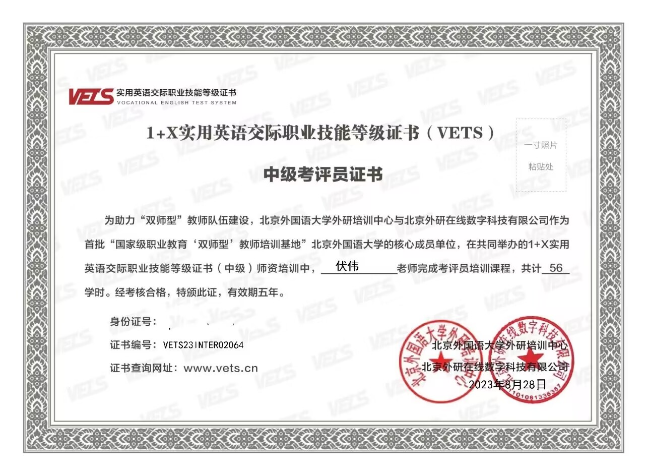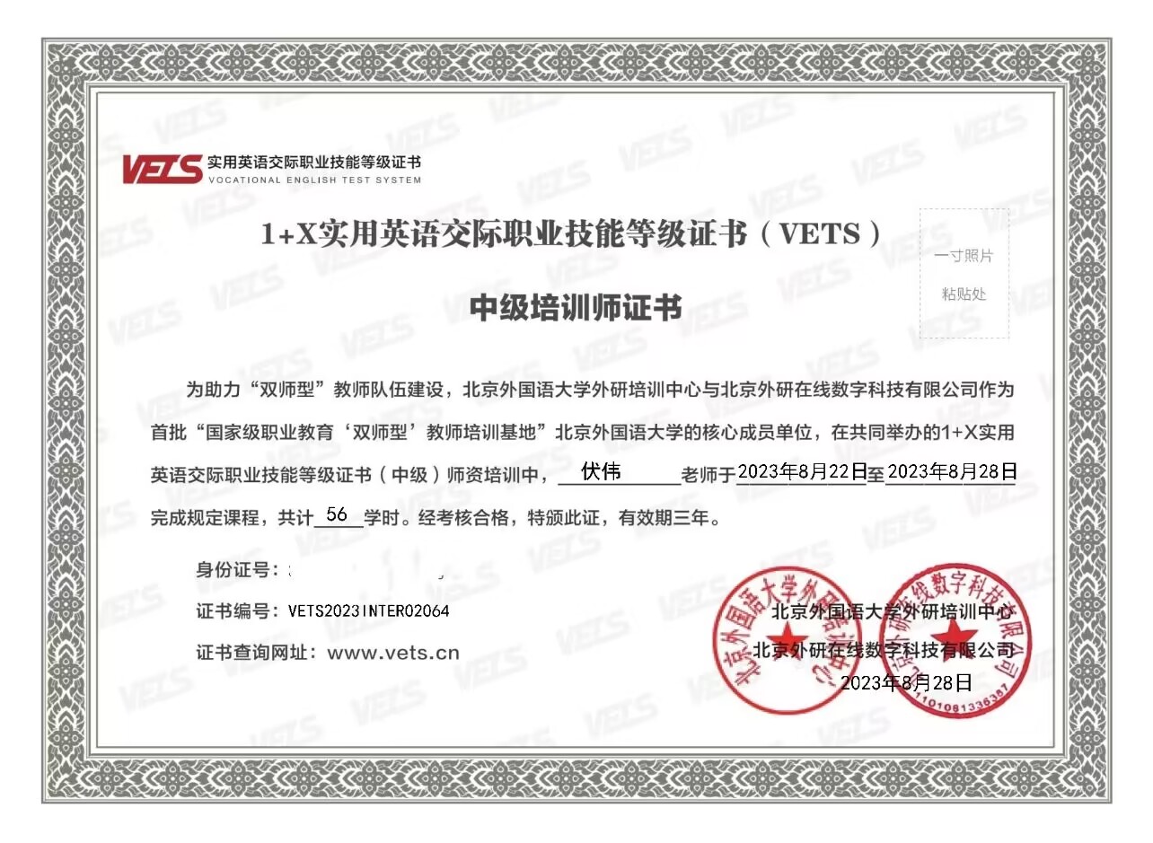 职业教育的高质量发展离不开高素质的教师队伍建设。为了进一步提升教师职业教育能力,外国语学院于8月22日至28日组织方宇波、伏伟两位老师赴哈尔滨参加了2023年“1+X实用英语交际职业技能等级证书(中级)师资培训班”。