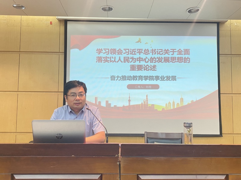 本次专题学习的主题是“学习领会习近平总书记关于全面落实以人民为中心的发展思想的重要论述,奋力推动教育学院事业发展”。学院院长孙旭作重点发言,从“习近平总书记的重要论述”“学校践行终身教育的使命与担当”“以学生为中心全面推进学院事业发展”三个部分分享了自己学习领会习近平总书记关于全面落实以人民为中心的发展思想的重要论述的心得体会。科学素养教学部主任陆峰和人文素养教学部副主任辛甜甜分别以“以人民为中心,坚守信仰”“坚守岗位,立德树人”为题,结合个人学习体会和部门工作作交流发言。