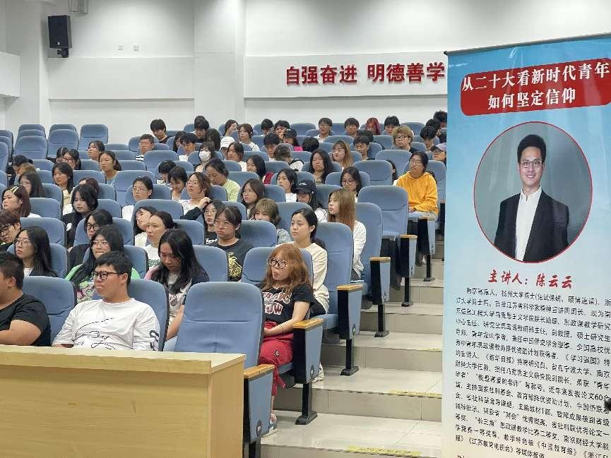 陈教授以“从党的二十大看新时代青年如何坚定信仰”为题,从“南京历史脉络”入手,通过历史知识,国际国内时事的旁征博引,用数据、图表深入浅出地讲授着新时代十年伟大变革的重大意义。他教育学生们要“身在校园,心怀天下”,主动适应新形势新要求,时刻将爱国和奋斗紧密结合起来,立志做有理想、敢担当、能吃苦、肯奋斗的新时代好青年,脚踏实地做意志坚定的爱国者和永不停歇的奋斗者。