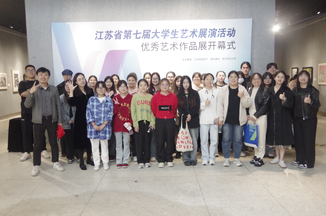 10月10日,江苏省第七届大学生艺术展演优秀艺术作品展在南京师范大学仙林校区美术学院美术馆开幕,我校团委牵头相关学院师生赴现场观摩。设计学院党总支副书记院娅、艺术作品指导教师代表蒋雪涵和团委干事彭熙媛等共同参加开幕式。
