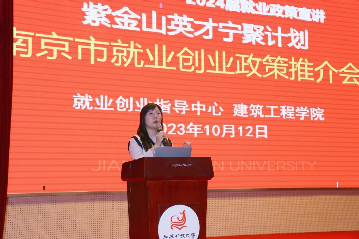 为加强就业指导,助力求职创业,10月12日中午,我校在应天校区体艺馆406室举办紫金山英才宁聚计划——南京市就业创业政策推介会。活动特邀南京市鼓楼区劳动就业管理中心创业负责人,高级人力资源管理师、职业信息分析师、经济师,和创新创业导师、创新创业讲师刘洁进校作专场宣讲推介。来自建筑工程学院的120余名同学聆听宣讲和参与现场交流。活动现场由辅导员江胜锋老师主持。
