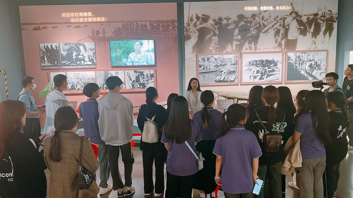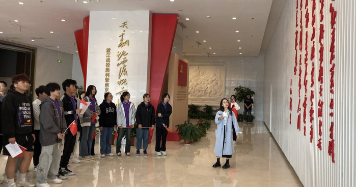 此次“行走的思政课”实践教学活动,与建筑工程学院2023级新生“思政第一课”融为一体。在前期的准备中,教师们和建筑工程学院积极对接,精心打磨讲解稿,多次现场踩点,最终组成了一支由思政课教师、学生预备党员和大一新生共同参与的讲解员队伍。活动当天,在南京渡江胜利纪念馆中,讲解员们从“开篇序言”“运筹帷幄”“决战千里”“军民团结”“革命到底”“见证胜利”6个部分,为同学们讲授“场馆里的思政课”,全面展示了渡江战役和解放南京的伟大历程。
