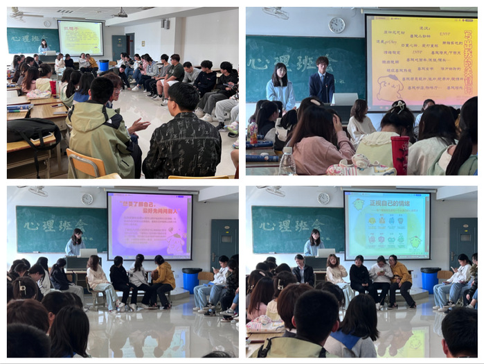 主题班会分三个环节。首先是破冰游戏“抓小鸭”,全班同学打破课桌椅的束缚,围坐一圈,从班长开始进行小游戏,伴随着“嘎,嘎”声和笑声,同学们逐渐卸下心中的包袱,融入到班集体的氛围中来。第二项活动是以宿舍为单位开展“真假猜猜猜”的游戏,这个活动通过写出自己的五个关键词来介绍自己和重新审视自己,并通过他人对自己的评价更全面客观地认识自己,意识到自己可能忽视的问题,相互进一步加深了解。最后一项活动,主持人总结了常见的八种情绪,和同学们一起探讨八种情绪背后存在的一个个未满足的心理需求,分享在面对突如其来的负面情绪时,可以通过哪些有效的方法来调整、控制和稳定自己的情绪。