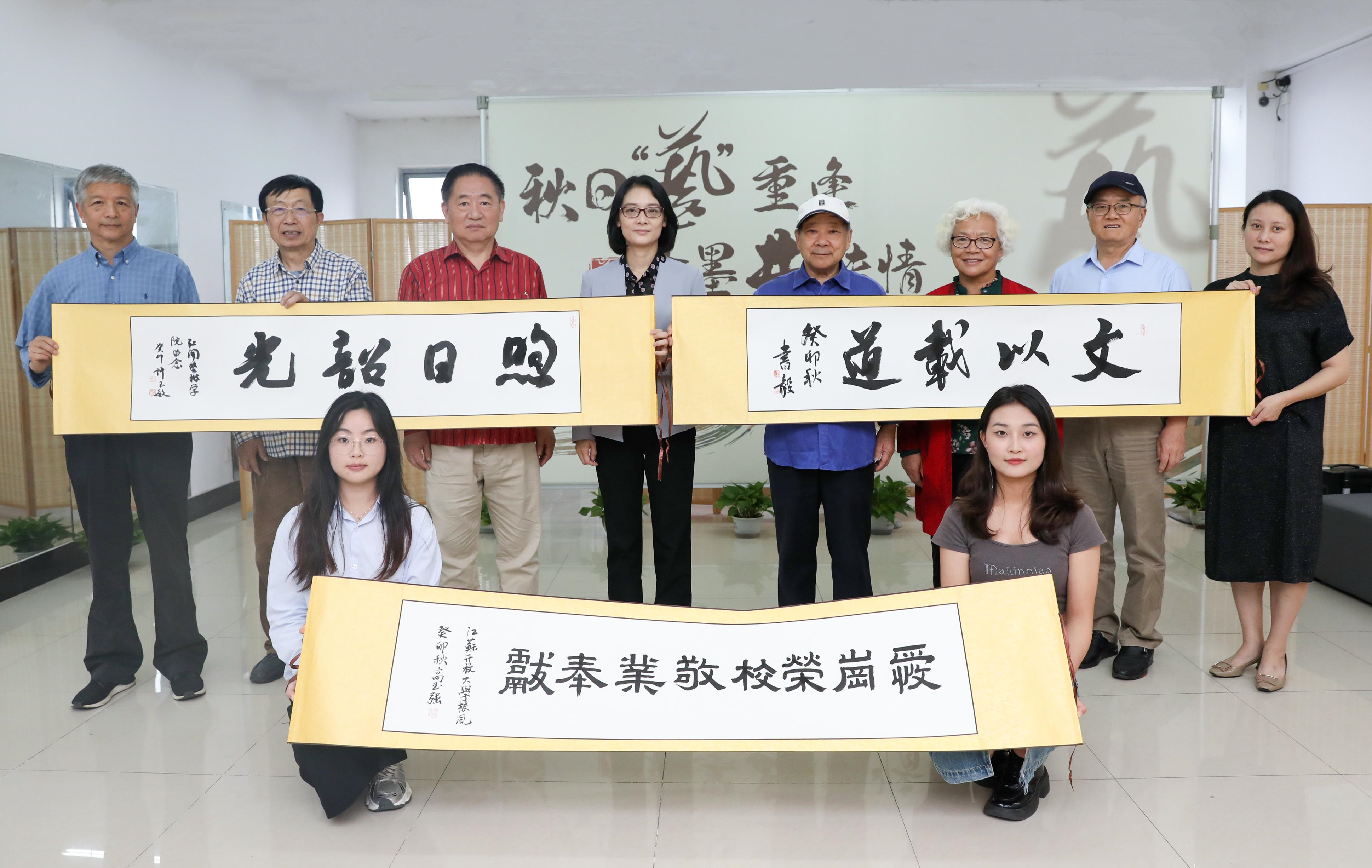 随后,高玉强、许玉敏、王书毅三位校友现场创作书法作品为母校送上诚挚的祝福。翰墨飘香,笔润校园。校友们蘸墨、挥笔,一气呵成,一笔一划书写出对母校的深深祝愿。许玉敏校友写下“煦日韶光”,字字浑厚圆润,是追忆,是赞许;王书毅校友写下“文以载道”,铿锵有力的文字里蕴藏着深切的情感;校风“爱岗、荣校、敬业、奉献”八个大字在校友高玉强的笔下,变得越发灵动清丽。校友们纷纷感慨纸短情长,道不尽对母校的眷恋之情。