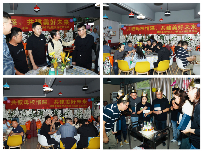 11月4日上午,校友们五湖四海而来,齐聚应天校区教学楼前露天草坪参加学校举办的校友返校仪式。仪式结束后,学院为10位在11月生日的校友、师生共同举办了集体生日会。校党委常委、副校长杭祝洪出席活动。建筑工程学院党总支书记曹永、副书记徐亚、师生代表及校友共同庆生。集体生日会上,徐亚代表学院对校友们的到来表示热烈欢迎,对各位校友长期以来对学校建设发展给予的关心和支持表示衷心的感谢。杭祝洪、曹永为向学院捐赠助学金和教学实验软件的校友周鹏、祁德胜颁发捐赠证书,为11月生日的校友、师生赠送了学院精心设计的文创纪念品。生日会上大家欢聚一堂,聚焦学校发展,追溯青春往事,畅谈毕业感悟,大家整齐温暖的《生日快乐》歌声萦绕食堂,表达对校友和师生生日的祝福和对母校的深情厚谊。