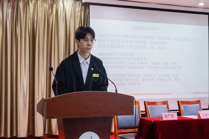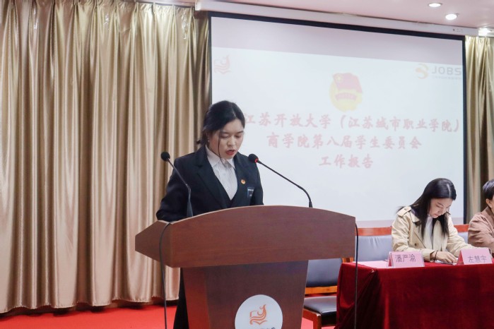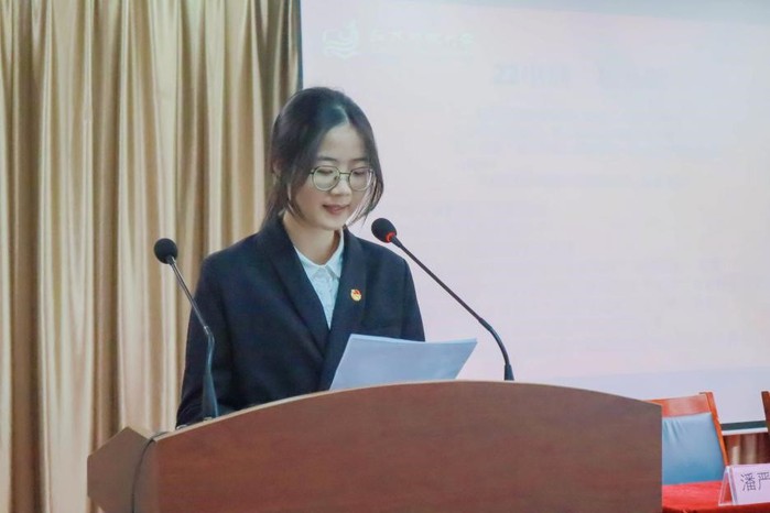 潘严渝代表商学院第八届学生委员会向大会作工作报告,总结过去一年学生会工作的成效和不足,为后续学生会的改革与发展提供新的思路。她希望新一届学生会干部在未来工作中,继续保持严谨的工作作风,规范工作态度,提升工作能力和服务水平,坚守学生会的初心和宗旨,继往开来,砥砺前行,共筑新华章。