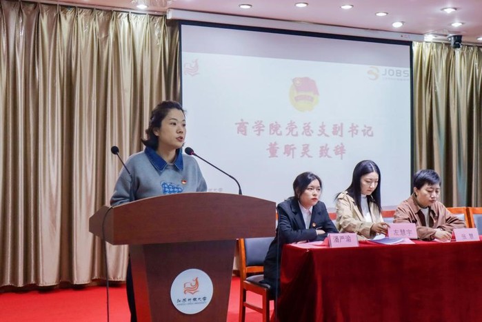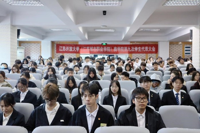 2023年11月7日12:00,江苏开放大学(江苏城市职业学院)商学院第九次学生代表大会在东校区图书馆楼5楼报告厅举行,商学院党总支副书记(主持工作)董昕灵、副书记丁晓华、学工办主任张慧、第二党支部书记任静静、全体辅导员、第八届学生会全体委员及180名正式代表参加会议,大会由商学院团总支副书记左慧宇主持。