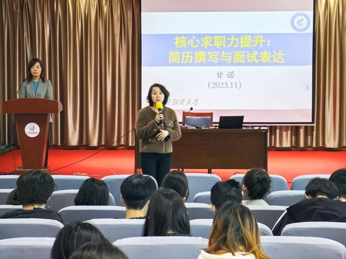 讲座主要分为简历撰写和面试表达两个部分,甘诺教授基于面试官的视角,着重从简历的架构展开详细的讲解,就简历中个人信息、求职意向、教育背景、学业成绩、专业实习、社会实践、校园活动、技能证书、所获奖励等模块的填写对同学们进行细致的指导。她深度剖析HR筛选简历的原则,提出撰写简历信息要明确、排版要简明、亮点要突出。针对求职面试,她解读面试的考察内容和常见题型,详细介绍个体面试和群体面试的特点、难点与对策,对于无领导小组讨论的程序和评价标准以及自我介绍进行深入地分析和阐释。