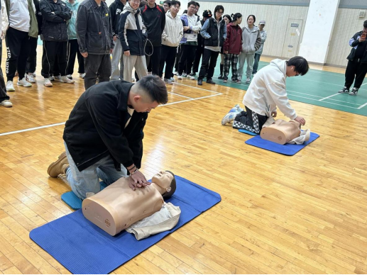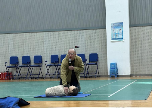 培训会上,陈一夫老师用通俗易懂的语言讲解了心肺复苏、气道异物梗阻及AED等急救知识,并在现场示范练习心肺复苏术、气道异物梗阻急救等实用救护技术以及救护过程中的注意事项。陈老师还结合生活实际,帮助同学们列举了日常生活中可能会遇到的心搏骤停的现象以及识别的方法,他通过急救理论讲解、急救实操演示,帮助学员们识别心搏骤停现象,树立心肺复苏急救意识,最大程度上给予他人生命支持。