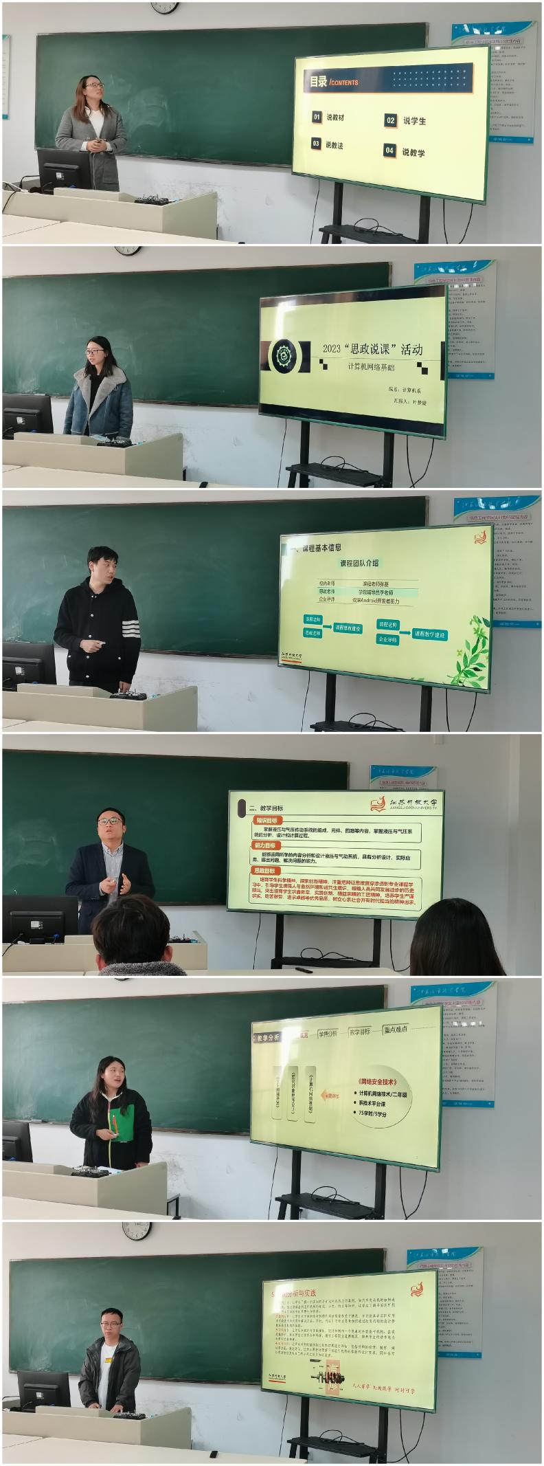 本次思政比赛共分为教案比赛和说课比赛两个环节,专家根据提交的材料评比出10名教师进入现场说课比赛环节。比赛中,参赛教师从各自专业课程出发,结合育人目标挖掘思政元素,围绕立德树人根本任务,引用实际案例,自然、有机地将思政元素融入到课程教学内容中。专家们针对选手的表现给予了充分的点评和中肯的建议。
