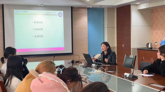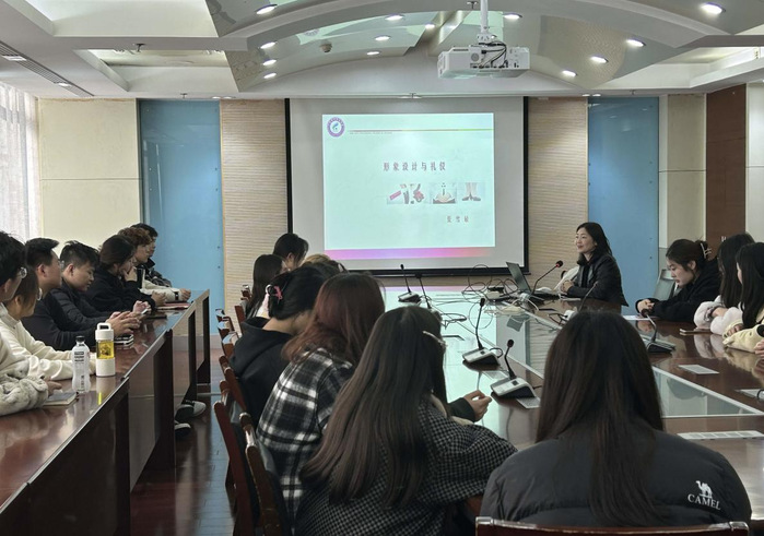 夏学敏老师是国家文化部时尚形象设计师,曾赴美国加州大学进修,并受邀担任2014年南京青奥会开闭幕式造型设计,具有非常丰富的形象设计和礼仪指导的经验。此次讲座内容丰富、实操性强,共分为四部分:形象礼仪、仪态礼仪、接待礼仪及礼仪实践。在形象礼仪部分,夏老师首先由浅入深地阐释礼仪和形象的概念与内涵,重点强调了形象对于个人和团队的重要性,从基础礼仪、职场礼仪等方面指导同学们如何根据自身特点和场合需要打造得体的服饰搭配和仪容仪表。在仪态礼仪部分,夏老师针对学生日常的言行举止进行了深入讲解,从站立、坐姿、步姿、行姿、握手礼、微笑礼仪等方面细致指导大家在不同场合如何保持优雅、自信的姿态。接待礼仪环节,夏老师通过丰富的图片实例展示,指导同学们如何在各种活动做好充分准备,包括自我介绍、沟通交流、公务接待等。