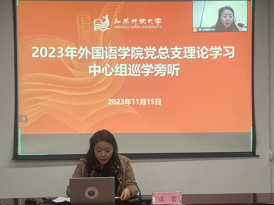 党委巡学旁听第四工作组组长成蕾为此次活动做点评。她充分肯定了外国语学院党总支理论学习中心组的学习活动,认为此次交流的内容丰富,学习效果显著,既有既定计划的落实,也有跟进学习的“第一议题”的学习、既采取了线下的深入的面对面的学习研讨,也采用了线上线下互动的省市开大联学的方式,是一场质量较高的集中学习。就进一步推进二级党组织的理论学习中心组学习的制度化,规范化,她提出三点建议,一是持续深化理论学习,强化思想武装;二是突出示范引领,扛起主体责任,推动理论学习,提质增效;三是善学,善思善用。做到学以致用,把理论学习成效转化为高水平开放大学建设实践动能。