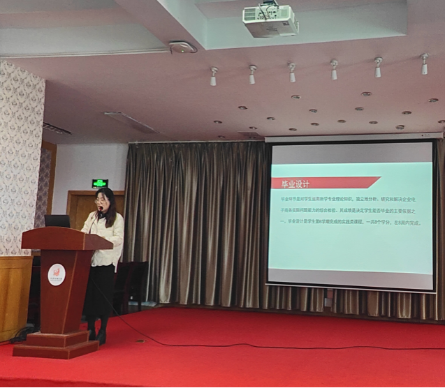 2023年11月23日,商学院国际电子商务系在东校区综合楼五楼报告厅开展2024届毕业设计及顶岗实习动员会。会议由国际电子商务系副主任姜璐主持,由系部教师严春燕、汪礼斌担任主讲,2024届电子商务专业与跨境电子商务专业全体毕业生参加了动员会。