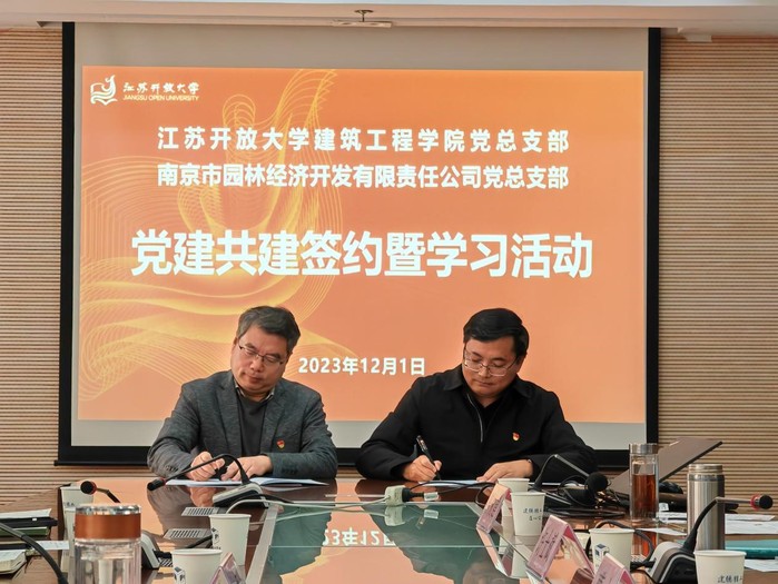 建筑工程学院党总支书记曹永 南京市园林经济开发有限责任公司党总支书记、董事长赵康兵签署党建共建合作协议
