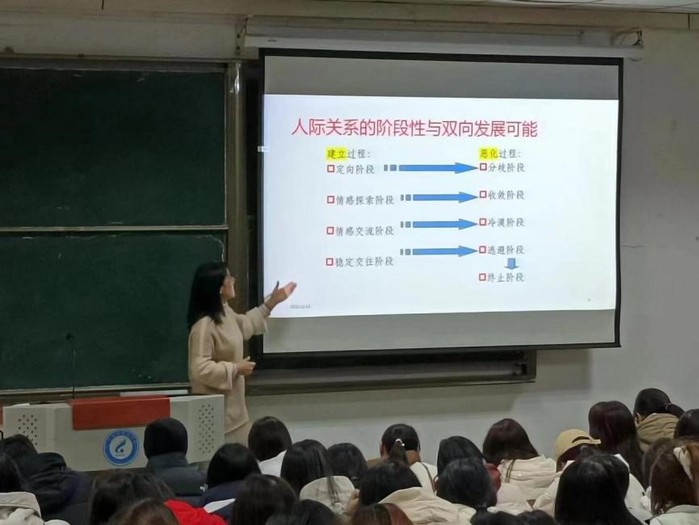 通过生动的故事案例和直观的多媒体画面,徐永珍带领同学们进行了一场心灵旅行。她以人际交往的重要性为切入点,细致分析大学生可能面临的各类人际关系问题及其产生原因,详细指导同学们解决人际冲突的正确做法,构建和谐人际关系的原则及注意事项,向同学们传授沟通的秘籍。