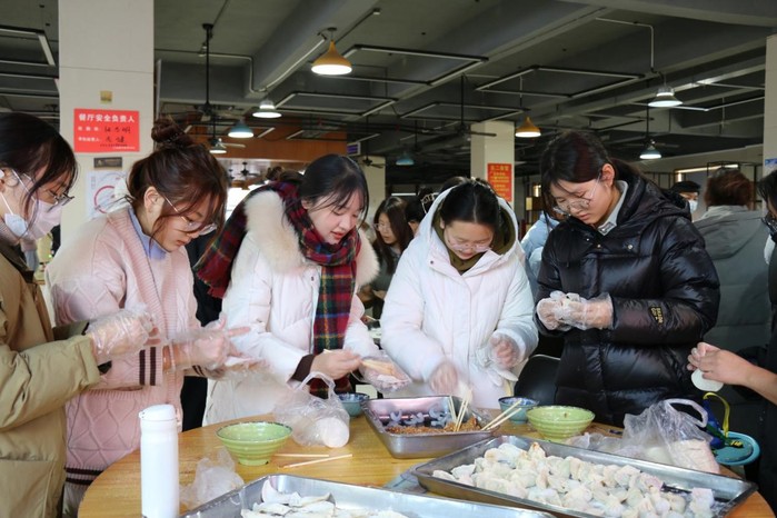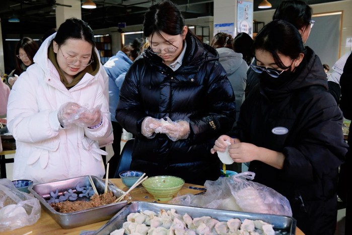 在冬至节气,吃一碗热气腾腾的饺子,象征团团圆圆、和和美美。为让大家吃得新鲜、吃得暖心,食堂工作人员协助学院早早购置食材,准备好馅料。活动开始,同学们纷纷撸起袖子,熟练地放馅料、捏饺皮,十指翻飞之间,一只只精巧可爱、形态各异的饺子诞生了。