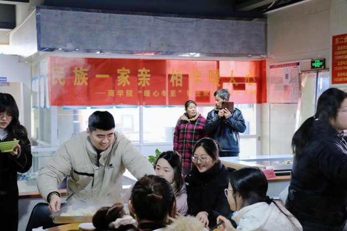 “冬至大如年,人间小团圆”,为弘扬中华传统文化,丰富同学们校园文化生活,增进各民族学生之间、师生之间的情谊,2023年12月22日中午11点,商学院于东校区食堂举办“暖心冬至”师生欢聚包饺子活动,副院长朱长春、党总支副书记丁晓华、辅导员、学生干部和少数民族同学共计40余人参加活动。