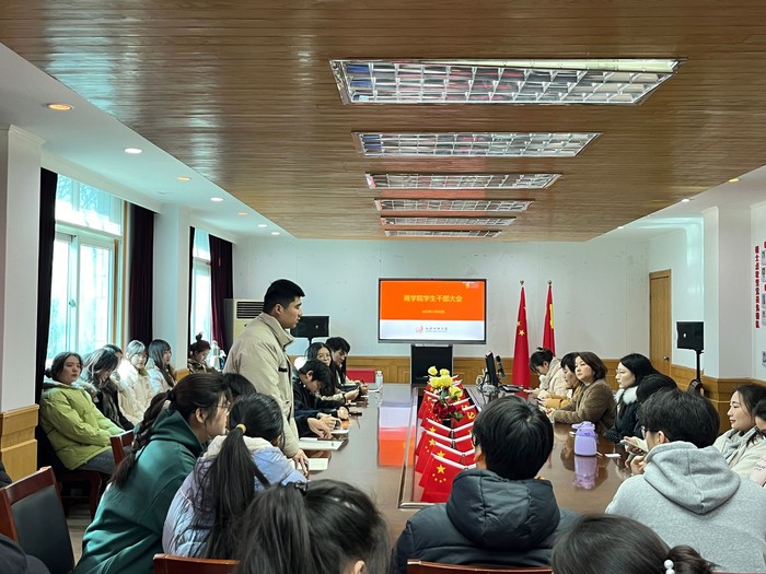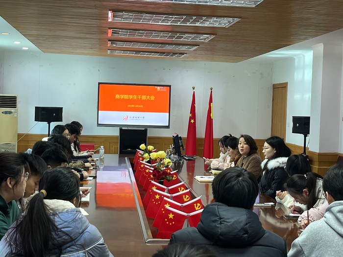 为进一步增强学生组织的工作凝聚力,提升学生干部工作实效,2023年12月25日中午12:00,商学院在东校区综合楼411室召开新一届学生干部大会。会议由团总支副书记左慧宇主持,学院党总支副书记丁晓华、学工办主任张慧、辅导员周皖宁及学院团总支、学生会全体学生干部参加。