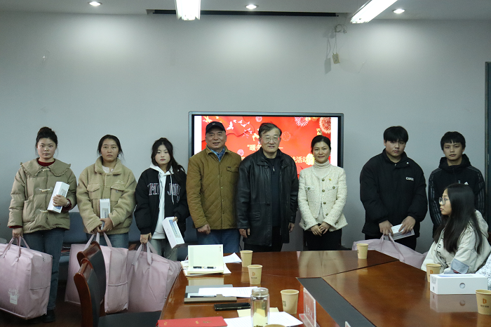 在暖冬物资发放环节,牛豫星、学院领导和参会党员教师为同学发放了棉被、水杯等爱心物资,送去冬日的真情暖意。